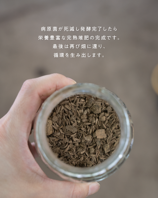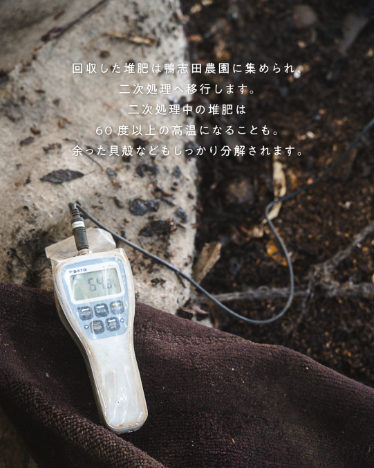 このとき堆肥の温度は60度以上に達することもあり、貝殻などの硬い素材もしっかり分解・熟成され、病原菌も死滅。
